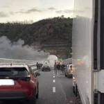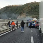 Banditi in azione nella corsia nord: due vetture date alle fiamme per bloccare l’autostrada, colpo dentro una galleria. Carabinieri e polizia in assetto da guerriglia, traffico paralizzato per chilometri