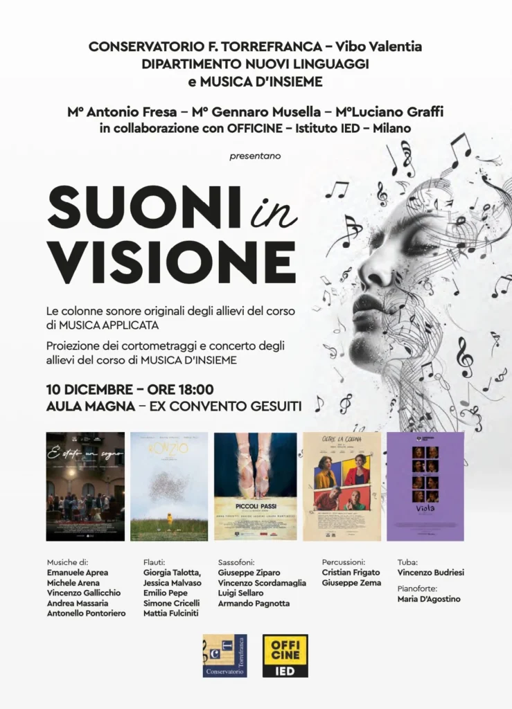 Mercoledì 10 dicembre, alle 18, l’Aula Magna del Conservatorio “Fausto Torrefranca” di Vibo Valentia, all’interno dell’ex Collegio dei Gesuiti, si trasformerà in un palcoscenico sospeso tra immagini e note grazie all’evento Suoni in Visione che invita il pubblico a un viaggio multisensoriale, dove cortometraggi e musica dal vivo si incontrano in un dialogo creativo e sorprendente. L’evento nasce dalla collaborazione tra la classe di Musica Applicata alle Immagini del M° Antonio Fresa, gli allievi della classe di Musica da Camera del M° Gennaro Musella e gli studenti del corso di Tecnico del Suono del M° Luciano Graffi.