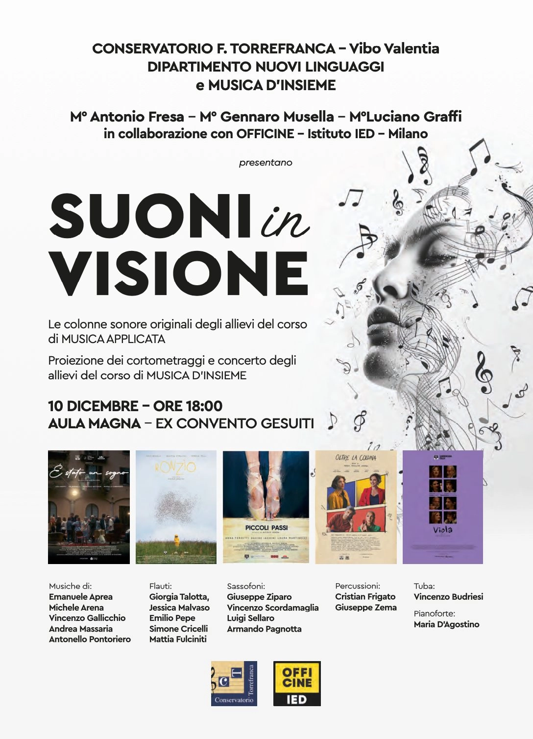Dopo la proiezione, gli allievi di Musica da Camera porteranno le immagini a vibrare nel suono, eseguendo dal vivo le musiche originali composte per i cortometraggi, in arrangiamenti realizzati appositamente per l’occasione. Il pubblico potrà così assistere al percorso creativo completo: dalla partitura alla performance, dalla tela cinematografica al gesto musicale, vivendo la trasformazione della musica in un linguaggio narrativo.