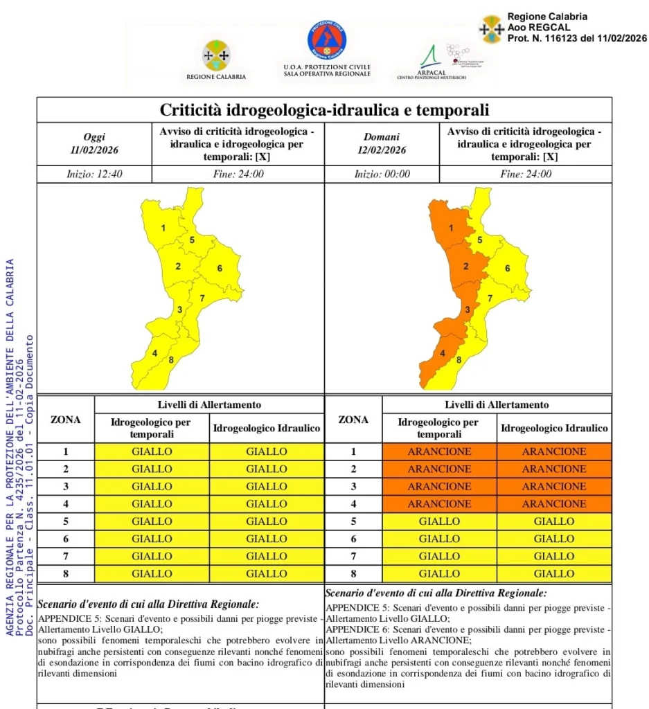 La Protezione civile ha diramato per domani 12 febbraio un’allerta arancione lungo l’intera fascia tirrenica (Cala 1, 2, 3 e 4) e un’allerta gialla sulla fascia ionica (Cala 5, 6, 7 e 8).