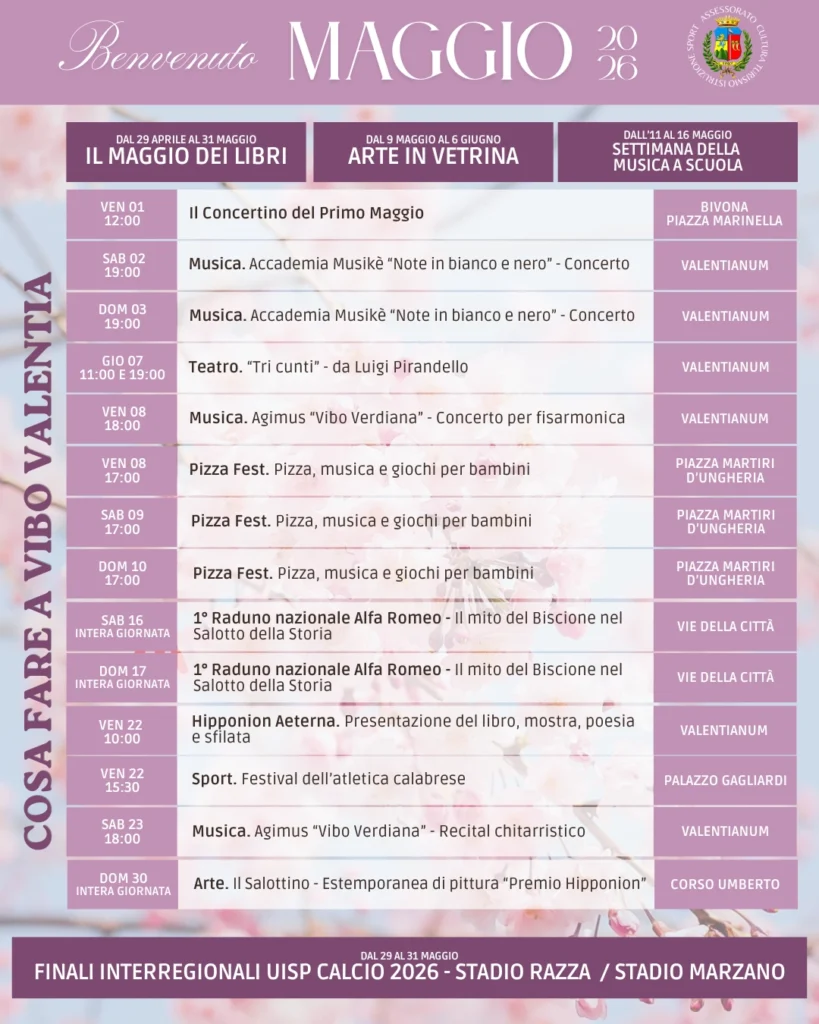 “Con questo calendario – dichiara l’assessore alla Cultura e Turismo, Stefano Soriano – abbiamo voluto offrire un programma ricco, capace di unire cultura, musica, sport, tradizioni e partecipazione. Vibo Valentia continua a crescere, e questi eventi rappresentano un invito a riscoprire i nostri luoghi, a incontrarsi e a condividere momenti di comunità. Per questo invitiamo cittadini e visitatori a partecipare agli appuntamenti di “Benvenuto Maggio”, un mese pensato per valorizzare la città e renderla protagonista attraverso cultura, creatività e socialità, sulla linea di quanto, come assessorato, stiamo portando avanti programmando per tempo tutte le attività e comunicandole ai cittadini con largo anticipo”.